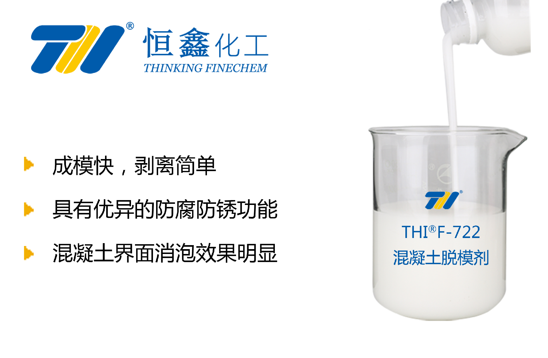 產品簡介THIF-722水泥混凝土脫模劑是一種新型高分子材料合成的脫模劑,環保配方,涂刷后在模板表面形成一層涂膜,將模板與澆注的混凝土隔離,具有成膜快,剝離簡單等優點。同時不影響混凝土表面效果,澆注出來的混凝土制品平整光滑。產品特點①成膜迅速,附著力好,提高工效,具有優異的隔離性能。